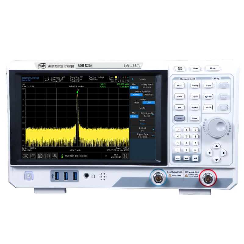 Анализатор спектра АКИП-4225/4 представляет собой высокотехнологичное измерительное решение, предназначенное для решения широкого круга задач в области радиочастотных измерений и электромагнитной совместимости. Его частотный диапазон от 9 кГц до 8,4 ГГц охватывает потребности множества приложений, от низкочастотных систем до устройств сотовой связи и радиолокации. Выдающаяся чувствительность прибора, определяемая уровнем собственных шумов до -161 дБм, в сочетании с низким уровнем фазового шума (-110 дБн/Гц) позволяет уверенно детектировать и анализировать слабые сигналы, что критически важно при исследованиях излучений и поиске неисправностей.
