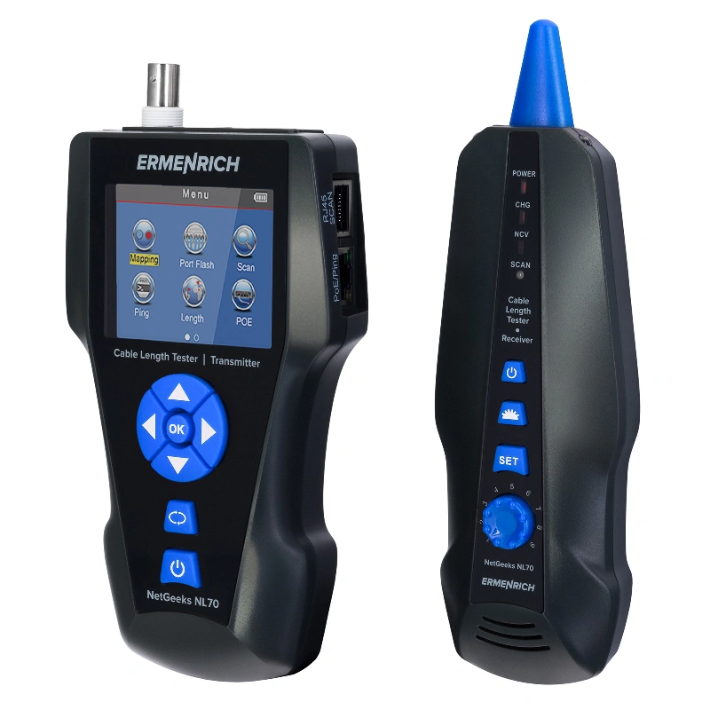 Ermenrich NetGeeks NL80 – это мощный комбо-прибор, который объединяет в себе точный измеритель длины кабеля и универсальный тестер. Благодаря технологии импульсной рефлектометрии (TDR) он без труда определяет длину линии до 1000 метров с минимальными погрешностями.