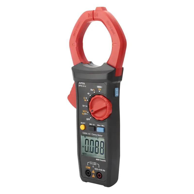 Модель APPA 41 позволяет измерять переменный ток до 1000 ампер в диапазоне частот от 40 Гц до 1 кГц с разрешением 100 мА, что обеспечивает высокую точность при работе с различными нагрузками. Прибор также измеряет переменное и постоянное напряжение до 1000 В с минимальным разрешением 1 мВ, что делает его пригодным как для бытовых, так и для промышленных задач. Базовая погрешность составляет всего ±1,5 %, что свидетельствует о надежности и стабильности показаний.