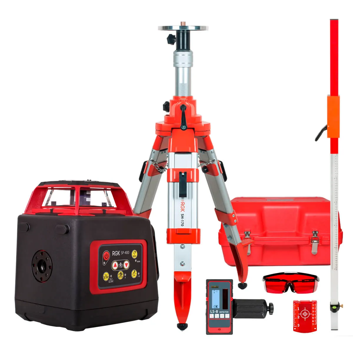 Радиус действия лазера ротационного нивелира RGK SP-400 при работе с приемником составляет 200 метров, а точность построения ± 1 мм на 10 метров. Это позволяет использовать лазерный уровень на крупных стройплощадках в качестве замены оптическому нивелиру.