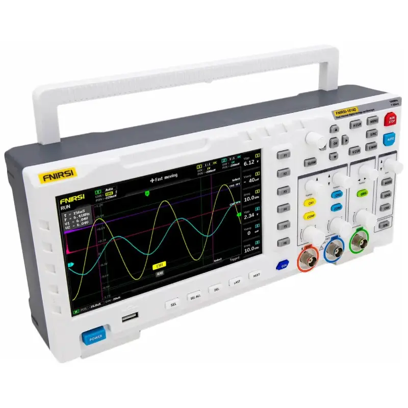 Осциллограф FNIRSI 1014D — два канала мощности и гибкости в компактном корпусе, предназначенный для анализа электрических сигналов в полевых условиях, мастерских и лабораториях. Современный дизайн, яркий дисплей и интуитивно понятное меню позволяют быстро запустить измерения, зафиксировать форму волны и сравнить сигналы разных узлов цепи. Расширенные режимы автоматических измерений, точная калибровка и поддержка временного захвата делают 1014D надежным инструментом как для начинающих, так и для профессионалов.