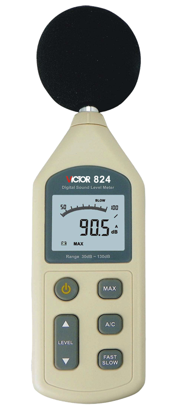 Шумомер Victor 824 имеет аналоговые выходные сигналы постоянного и переменного напряжения, пропорционального результату измерения для графопостроителя, для подключения анализатора спектра или осциллографа. Данный прибор позволяет запоминать минимальные и максимальные значения сигнала (MIN/MAX), а также имеет индикацию выхода регистрируемого сигнала за верхнюю или нижнюю границы измеряемого диапазона. Прибор имеет электретный конденсаторный микрофон, ветрозащитный колпак микрофона, большой ЖК-дисплей с аналоговой графической шкалой и подсветкой. Питание шумомера осуществляется от щелочной батареи на 9В типа 6F22 или источника постоянного тока 9В.