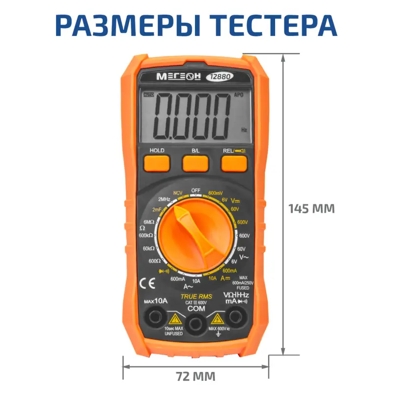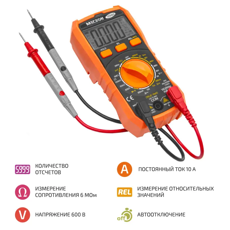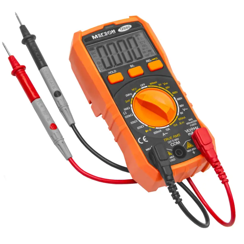 Цифровой мультиметр МЕГЕОН 12880 — портативное устройство, отлично подходящее для измерительных работ, определения значений постоянного и переменного (True RMS) напряжения, тока, сопротивления, частоты, ёмкости конденсаторов, а также может использоваться для выполнения тестирования диодов и прозвонки электрических цепей. Результаты измерений выводятся на ЖК-дисплей с легко читаемым цифровым индикатором 18 мм. Мультиметр МЕГЕОН 12880 можно установить на столе при помощи упора на задней части изделия, а режим энергосбережения и защита от перегрузки повышает удобство его эксплуатации. МЕГЕОН 12880 — оптимальный прибор начального уровня для лабораторий, производства и домашнего хозяйства. Благодаря комплектующим высокого качества увеличена точность прибора и снижено время проведение измерений. Изделие по достоинству оценят профессионалы и любители.