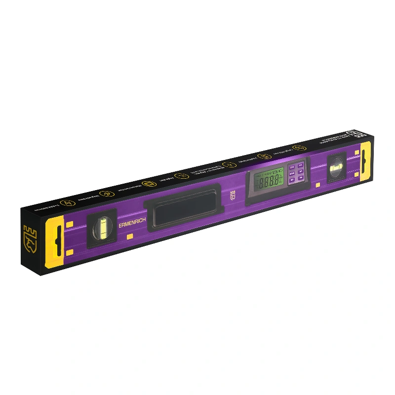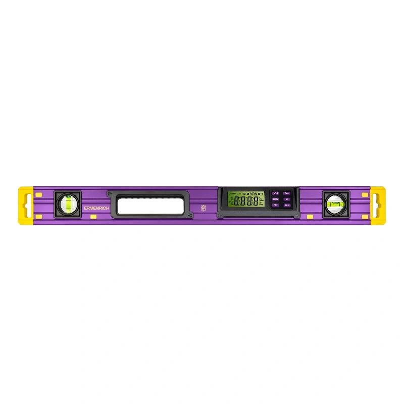 Цифровой уровень Ermenrich Verk LY60 фиолетовый создан для точной проверки плоскостей при монтаже, отделке и обслуживании инженерных систем. Длина 600 мм обеспечивает баланс между удобством в тесных зонах и стабильностью на протяженных участках, поэтому инструмент одинаково точно помогает измерять каркасы, направляющие, дверные и оконные блоки, а также контролировать уклон на трассах коммуникаций.