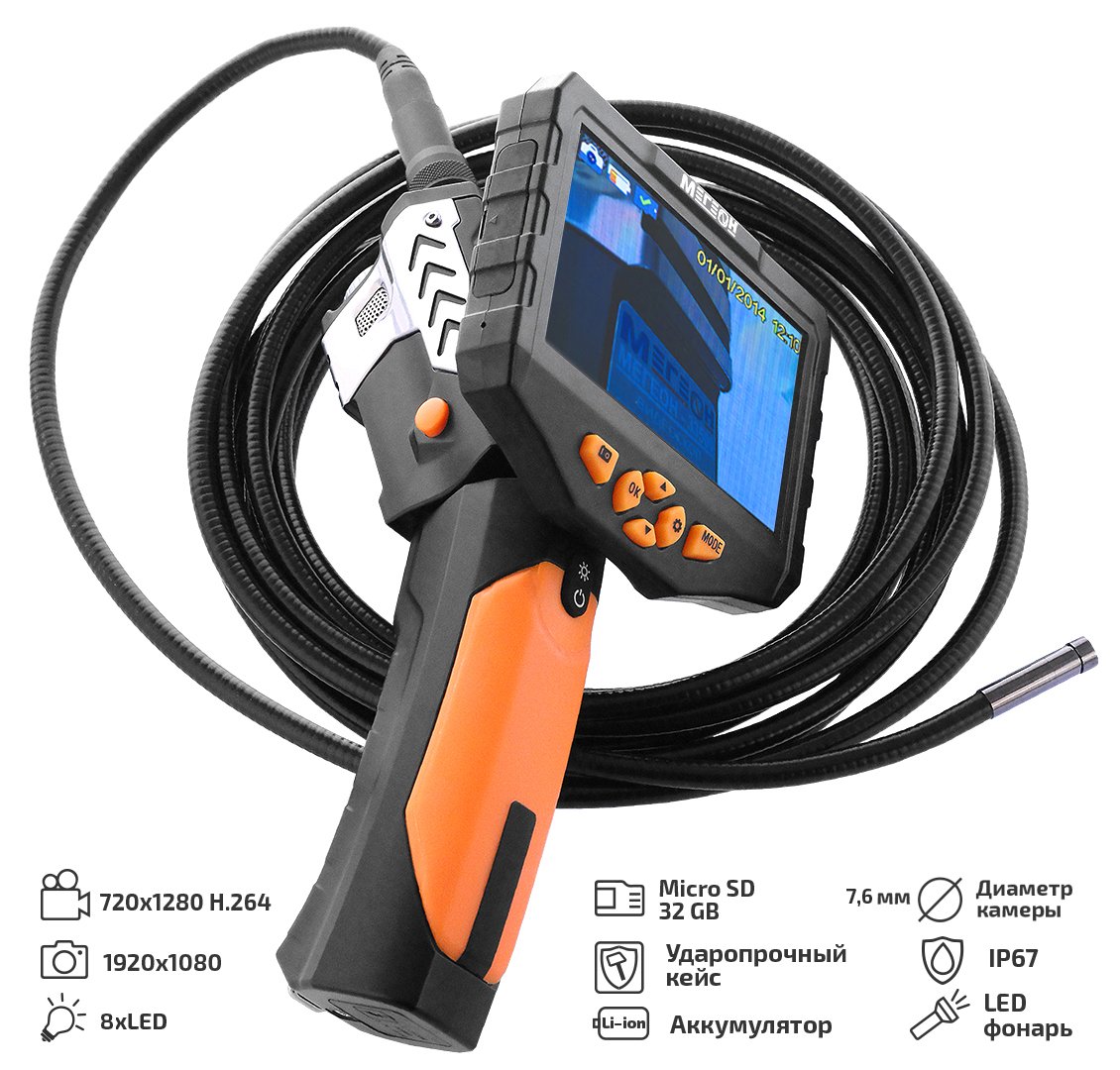 МЕГЕОН 33500-576 - новинка в модельном ряду цифровых видеоскопов, предназначенный для решения задач в быту и промышленности. Эндоскоп представляет собой устройство для исследования и осмотра скрытых от глаза полостей с возможностью сохранения видеоизображения со звуком на встроенный носитель SDHC 32Гб. Помимо этого предусмотрено получение цветных изображений с помощью фотографий. Большой ЖК-дисплей с разрешением 854х 480 и диагональю 4,3' отчётливо отобразит всё происходящее перед камерой. Зонд диаметром 6,9 мм и длиной 5 метров имеет полужёсткую конструкцию. Подсветка оснащена шестью яркими светодиодами со ступенчатой регулировкой яркости, которые обеспечивают работу в условиях полного отсутствия освещения. Дополнительно в корпусе предусмотрена подсветка с высокой интенсивности свечения, которая с лёгкостью заменит фонарик. Преимущества изделия по достоинству смогут оценить профессионалы и любители.