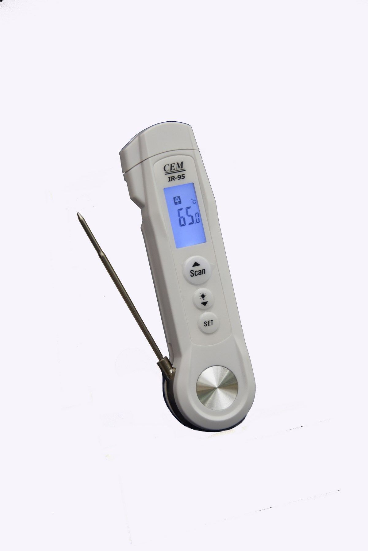 CEM IR-95 - прибор, который представляет собой инфракрасный термометр, оснащенный измерительным зондом (датчиком). Он позволяет измерять температуру поверхности и внутреннюю температуру объекта.