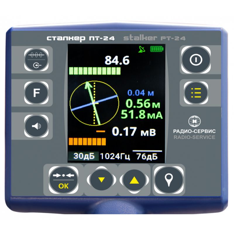 Приемник ПТ-24 является ключевым элементом комплекса, обеспечивающим прием электромагнитных сигналов от трасс. Он поддерживает активные частоты в диапазоне 273, 526, 1024, 8928 и 32768 Гц, что позволяет эффективно работать с сигналами от собственного генератора или других источников. Для пассивного поиска, когда нет внешнего сигнала, приемник настроен на частоты 50 Гц (режим POWER для силовых кабелей), 100, 300, 550 и 1450 Гц, а также специальные режимы "РАДИО" и "Эфир", адаптированные для обнаружения радиосигналов и эфирных помех. Кроме того, ПТ-24 совместим с оборудованием других производителей благодаря поддержке частот 491, 512, 982, 2000, 2048, 8440, 9828 и 10000 Гц, что делает комплекс универсальным и расширяет его применение в смешанных системах.