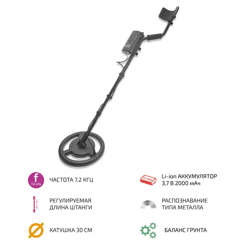 Металлоискатель работает на частоте 7,2 кГц, что обеспечивает высокую чувствительность и точность обнаружения. Катушка размером 30 см обеспечивает надежную работу устройства в различных условиях, включая высокую влажность грунта.