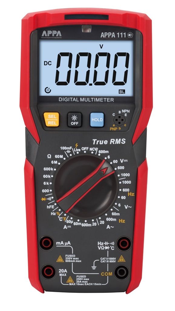 Мультиметр APPA 111 представляет собой современный цифровой измерительный прибор, сочетающий высокую точность, широкий функционал и надежность, необходимую для профессионального использования в электронике, электрике и обслуживании оборудования. Этот универсальный инструмент способен выполнять измерения постоянного и переменного напряжения до 1000 В с минимальным разрешением 0,1 мВ, а также тока — до 20 А, что делает его пригодным для диагностики как низковольтных, так и мощных электрических цепей. Благодаря разрешению по току 10 мкА прибор позволяет с высокой детализацией анализировать маломощные цепи и электронные компоненты.