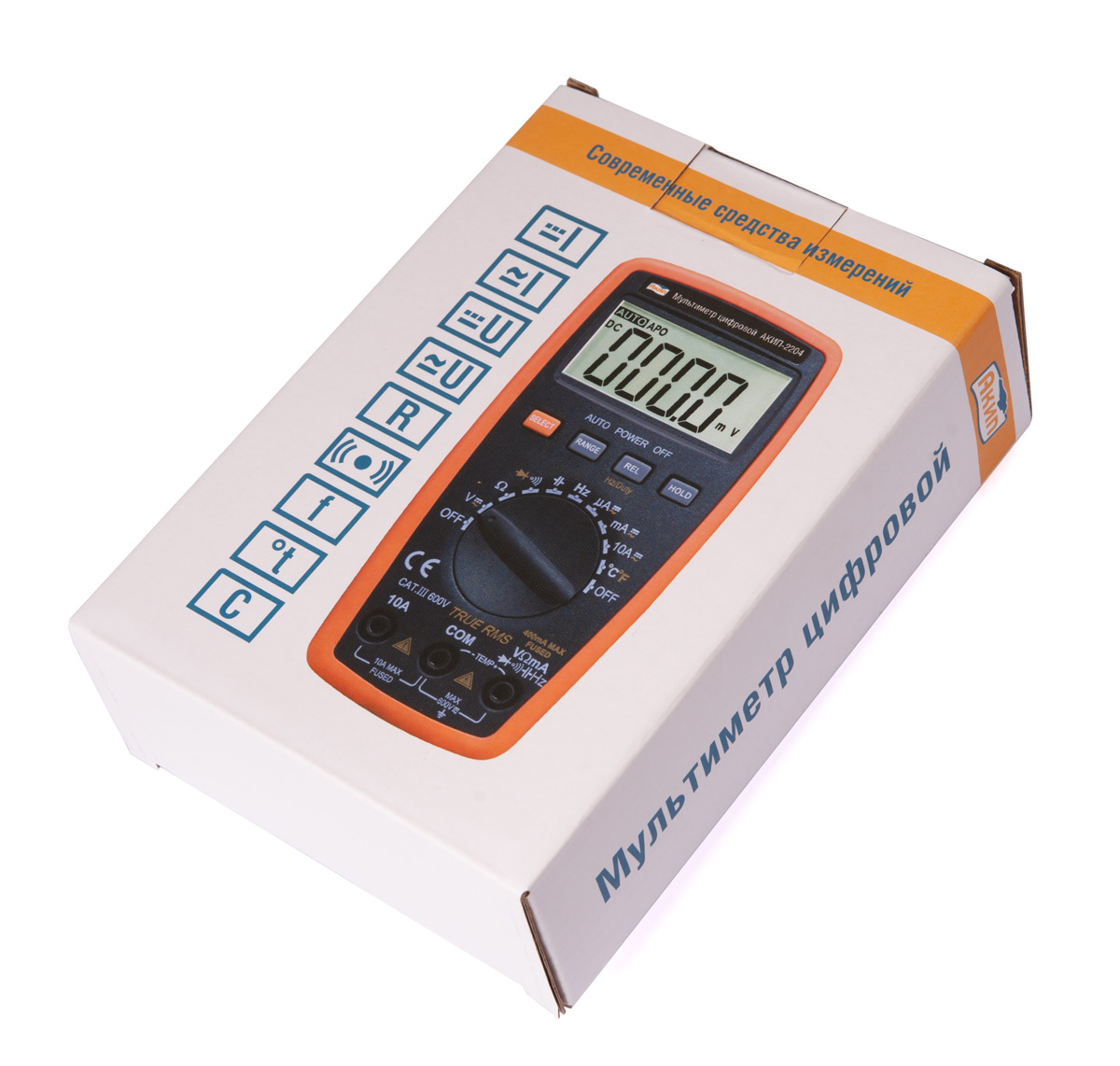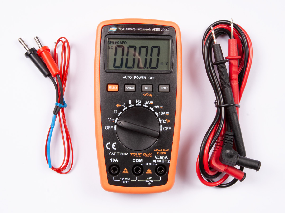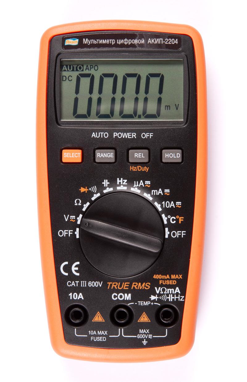 АКИП-2204 оснащён высокоточным цифровым дисплеем с разрешением 4000 отсчётов, что обеспечивает хорошую читаемость результатов и точную фиксацию значений. Он способен измерять как постоянное, так и переменное напряжение до 600 В, а также токи обоих типов до 10 ампер. Это делает прибор универсальным решением для работы с разнообразными электрическими цепями. Благодаря технологии TrueRMS мультиметр корректно отображает значения даже при измерении сигналов с нестандартной формой, что особенно важно при работе с инверторами, импульсными блоками питания и современными электроприборами.