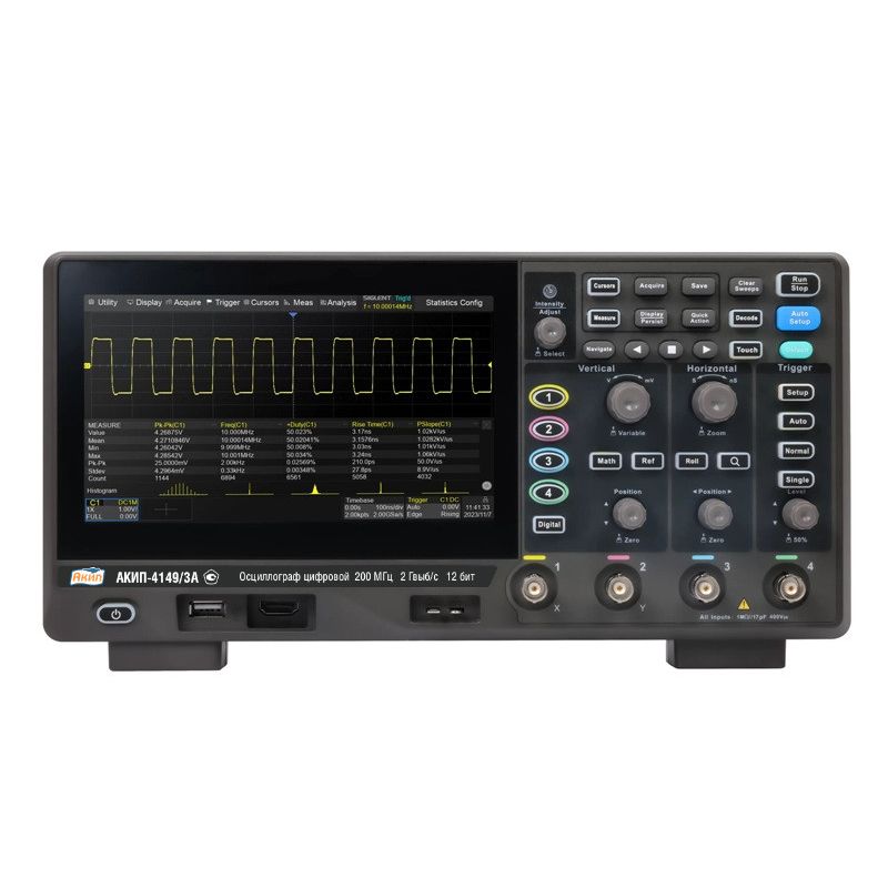 Дисплей осциллографа – TFT емкостный сенсорный с диагональю 17,78 см и разрешением 1024x600 пикселей – обеспечивает яркое и четкое изображение, а сенсорное управление делает интерфейс интуитивным и удобным для оператора. В целом, цифровой осциллограф АКИП-4149/3А является мощным инструментом, сочетающим высокую производительность, гибкость настроек и широкий набор функций, что делает его незаменимым для инженеров, исследователей и специалистов в областях электроники, телекоммуникаций и автоматизации. Этот прибор не только соответствует современным стандартам, но и открывает новые возможности для глубокого анализа и оптимизации электронных систем.