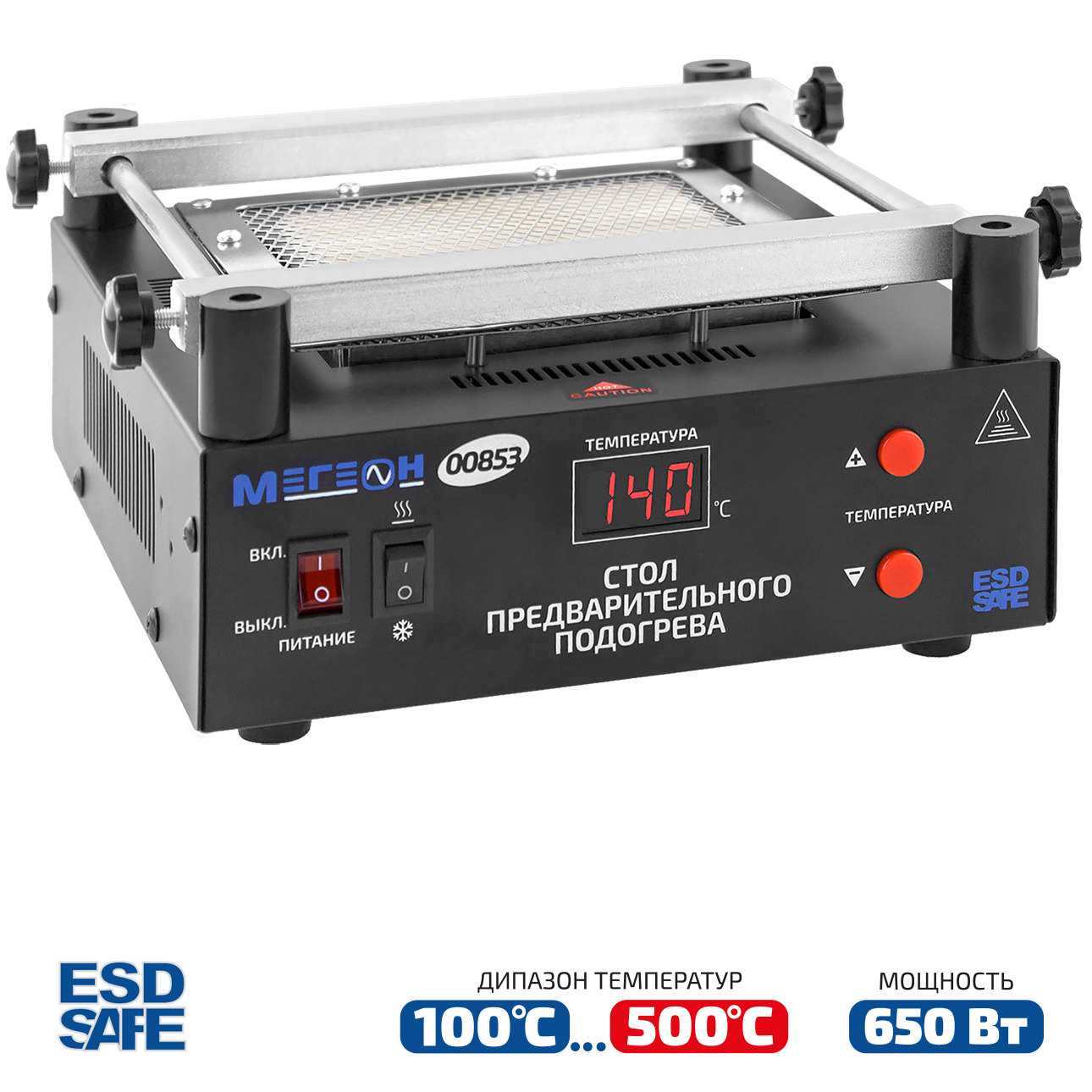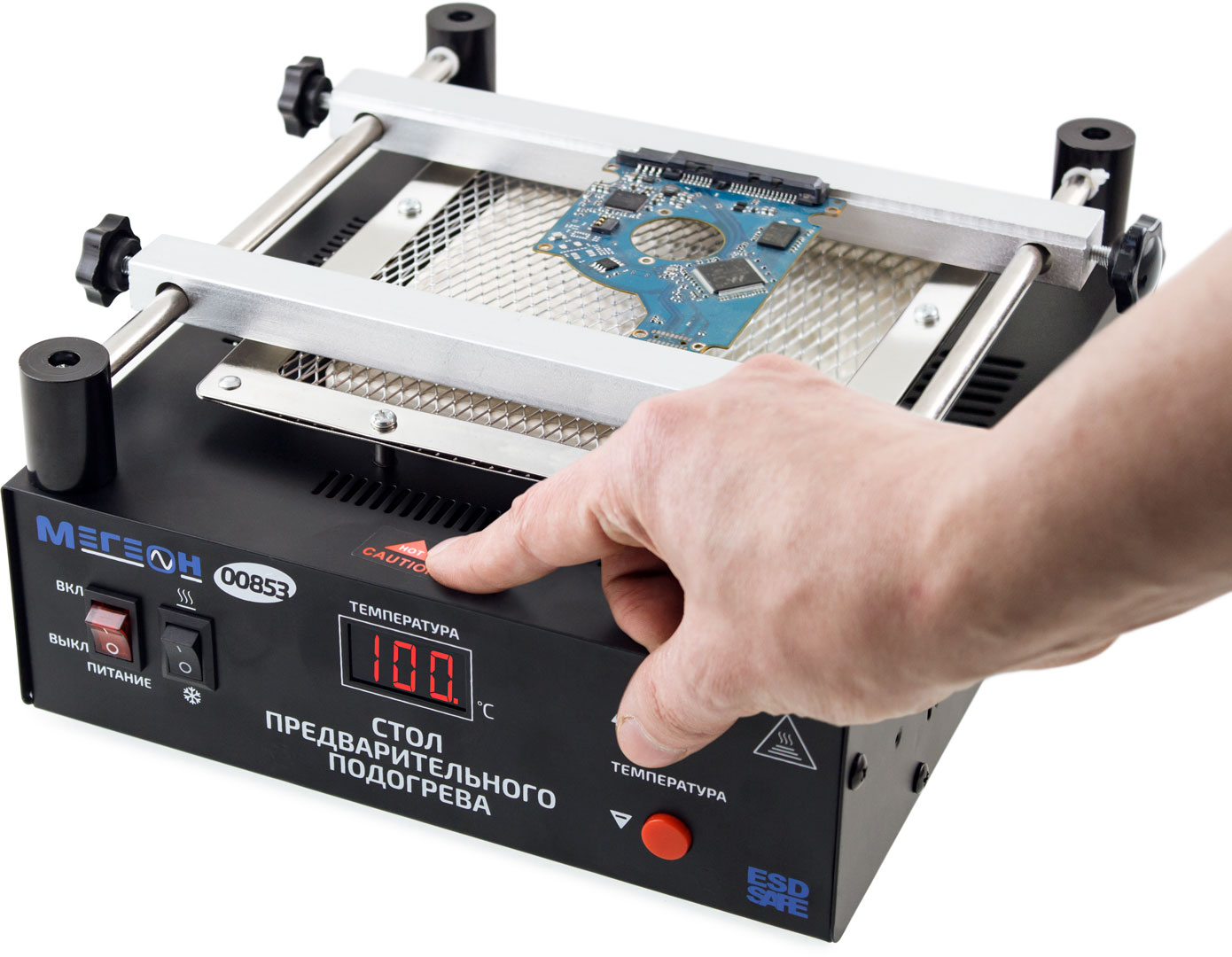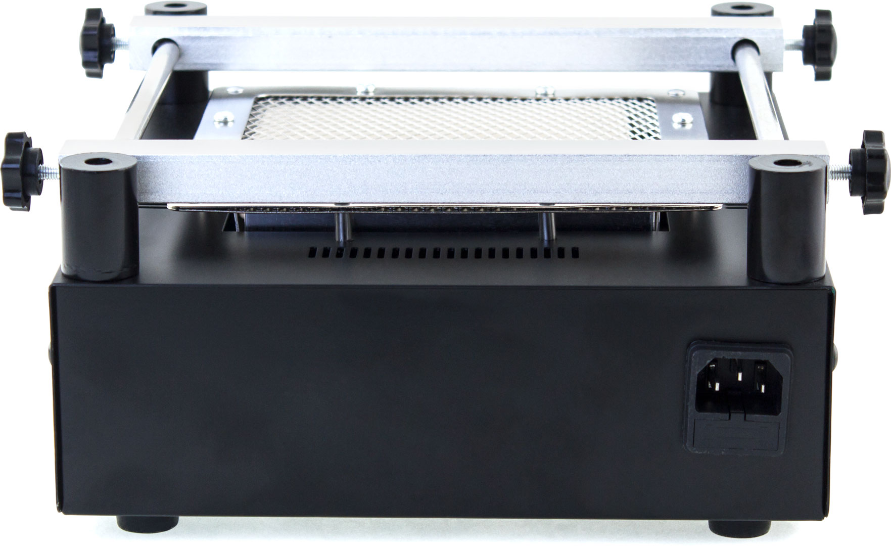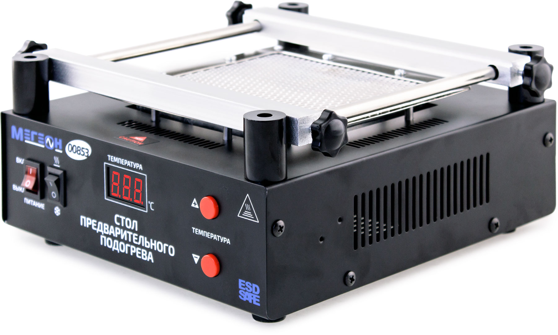 Стол предварительного нагрева МЕГЕОН 00853 предназначен для подогрева печатных плат во время ремонта и монтажа электрокомпонентов. Предварительный нагрев позволяет избежать термоудар и перегрев компонентов, а также значительно улучшает качество пайки и упрощает работу. Конструкция прибора обеспечивает равномерный нагрев платы по площади 120х120 мм. Также в конструкции элементов управления реализована возможность плавного регулирования температуры нагревательного элемента с возможностью отслеживания показаний на LED- экране. С целью увеличения срока службы прибора и безаварийной работы в конструкции был применён керамический нагревательный элемент. В конструкции также предусмотрена возможность регулировки размера держателя под размер печатной платы. Держатель оснащён удобными фиксаторами, что позволяет надежно закрепить плату.