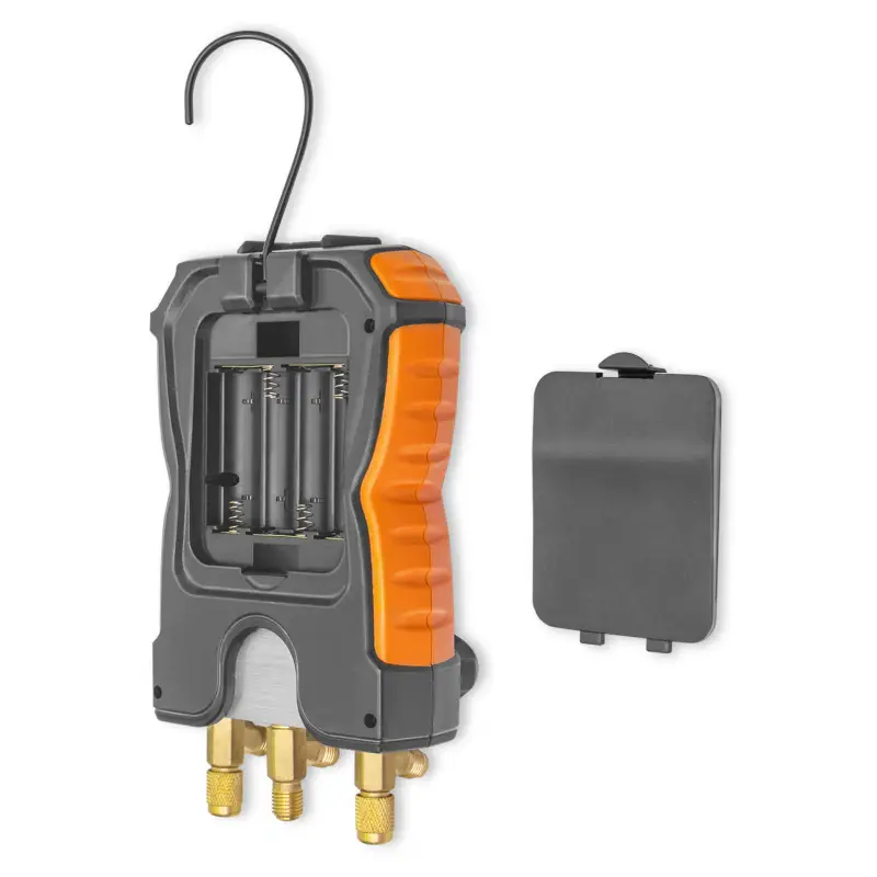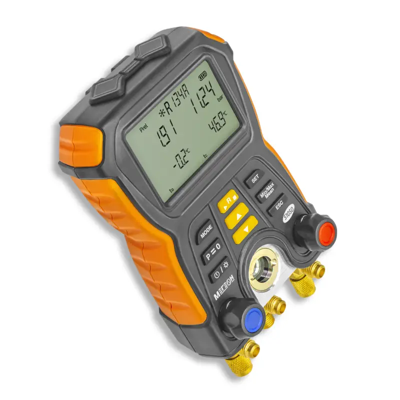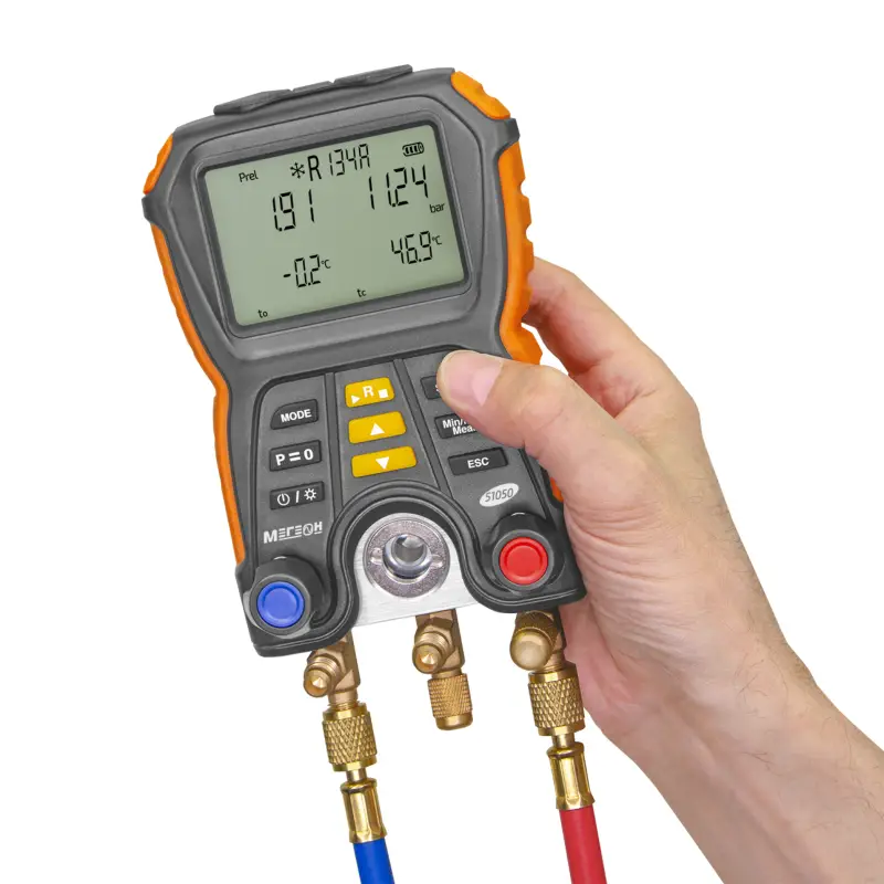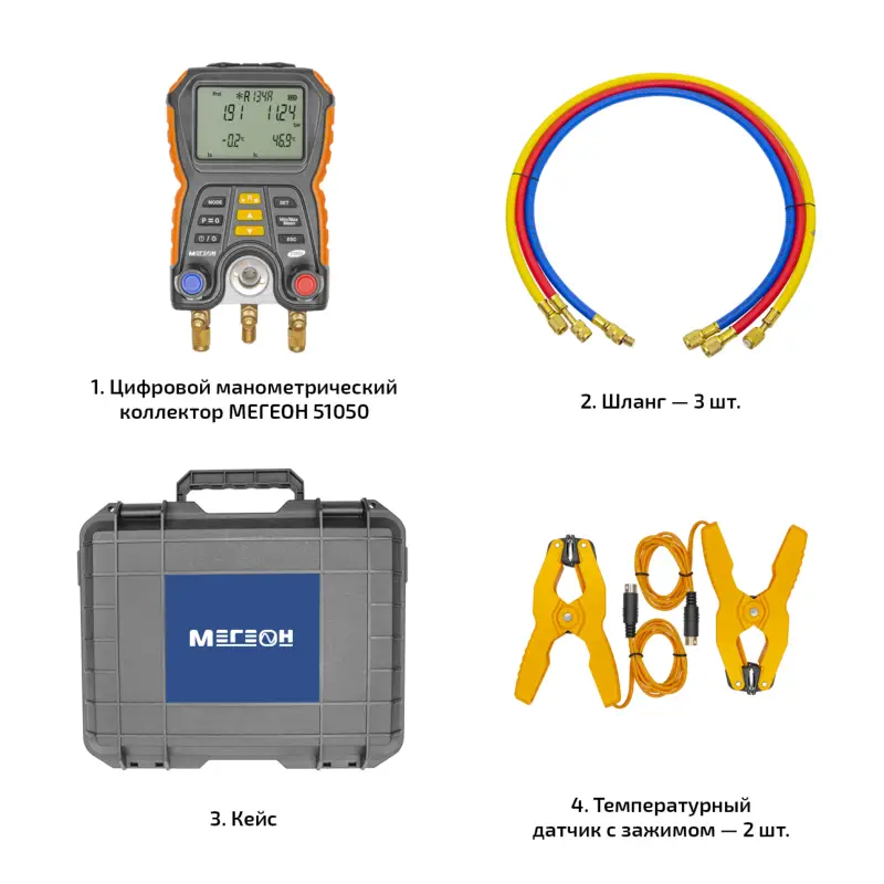 Цифровой манометрический коллектор МЕГЕОН 51050 представляет собой высокотехнологичное устройство, предназначенное для точного измерения давления и температуры в различных системах, включая системы кондиционирования и холодильные установки. Этот коллектор оснащен двумя входами, что позволяет одновременно контролировать давление в двух разных точках системы.