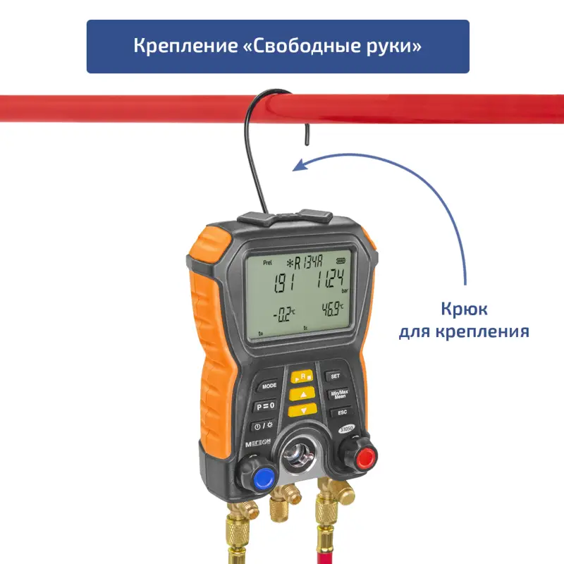 Коллектор также имеет крюк для подвешивания, что позволяет легко и удобно хранить его в различных местах. Это особенно полезно в полевых условиях, где коллектор может быть использован для измерения давления и температуры в различных системах.