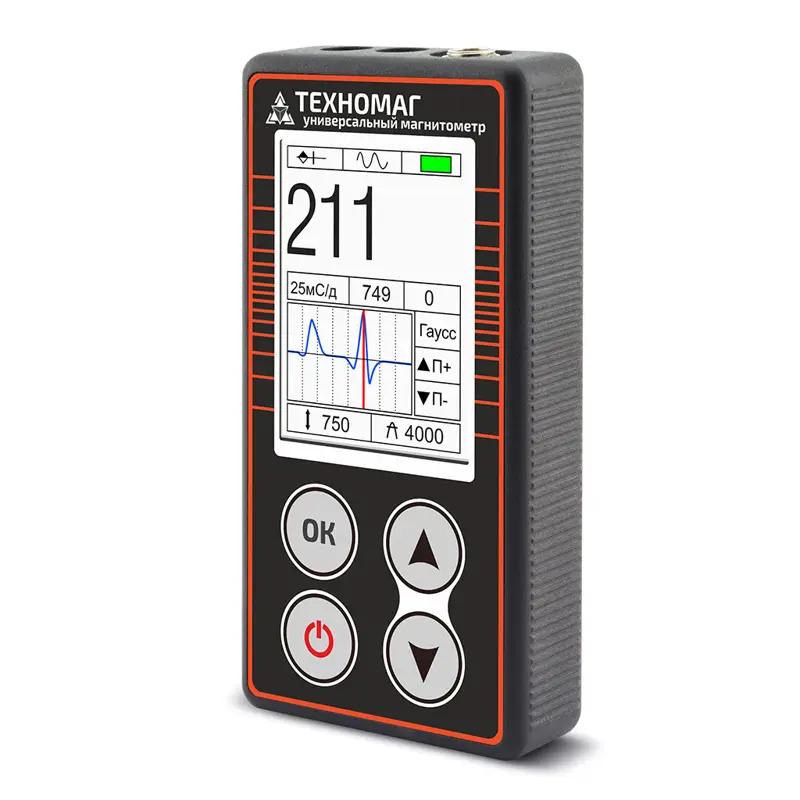 Универсальный магнитометр «Техномаг» предназначен для измерения индукции/напряженности постоянного магнитного поля и ее градиента, пиковых и среднеквадратичных значений индукции/напряженности переменного магнитного поля, пиковых значений индукции/напряженности однократных импульсов магнитного поля. Он позволяет решить широкий круг измерительных задач. Прибор применяется для оценки остаточной намагниченности, контроля намагничивания при использовании переменного, постоянного или выпрямленного тока промышленной частоты, выявления локальных магнитных полюсов, определения амплитуды однократных намагничивающих импульсов поля, измерения напряженности поля в А/м или А/см, градиента напряженности в А/см2, а также индукции в мТл или мкТл.